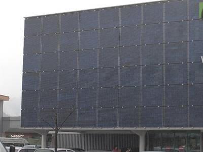 Hier entstand eine neue Fassaden-PV-Anlage mit ca. 20 KWp installierter Leistung an einem Einkauszentrum.